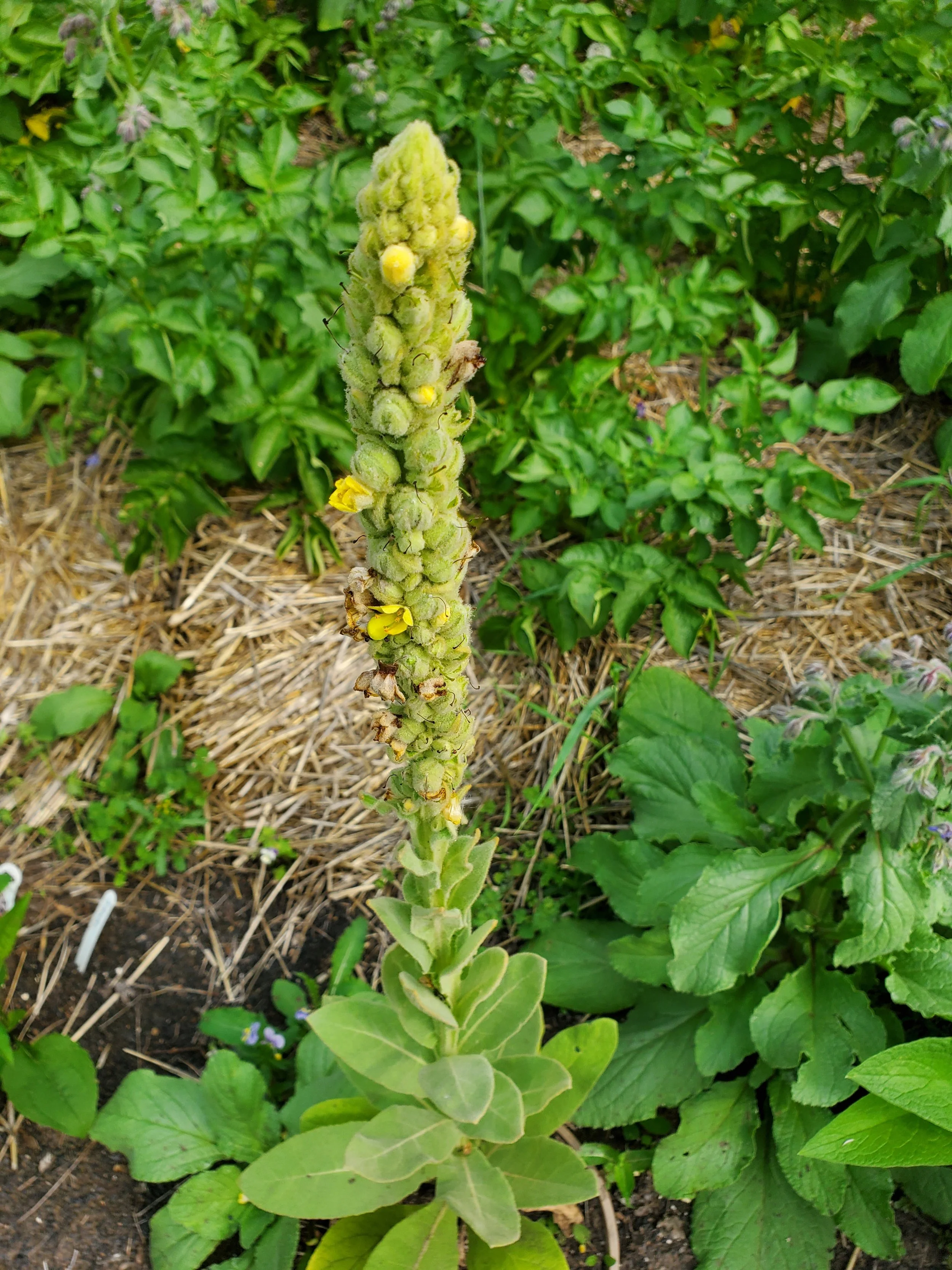 Mullein flower stalk with fuzzy leaves at its base; that is a borage plant to the right and elderberry plant at the top